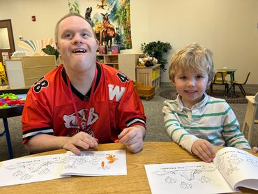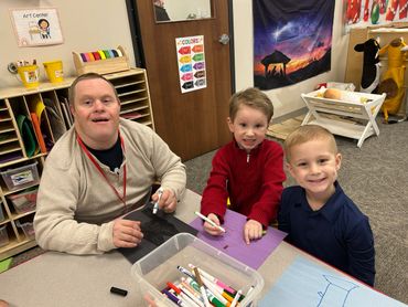 Preschool ambassadors are adults with intellectual and developmental disabilities who volunteer each week in a classroom and gain meaningful work and life experience. Ambassadors interact with students during free play and gym time. Ambassadors may be assigned extra work tasks that enhance the goals set by parents of the ambassador such as shredding paper or helping with gardening. Ambassadors are always accompanied by a Direct Support Professional.